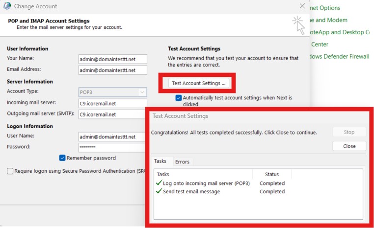 หลังจากตั้งค่าแล้วให้กดปุ่ม Test Account Setting หากตั้งค่าถูกต้องจะเจอข้อความแบบนี้