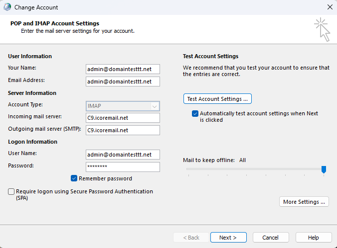 การตั้งค่าผ่านโปรแกรม Outlook แบบ IMAP ตั้งค่าดังนี้ครับ