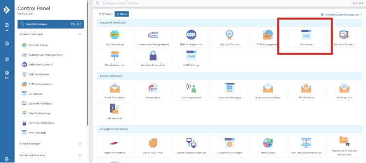 1. Login เข้าระบบ Control Panel DirectAdmin ที่หัวข้อ Account Manager คลิกที่เมนู Databases