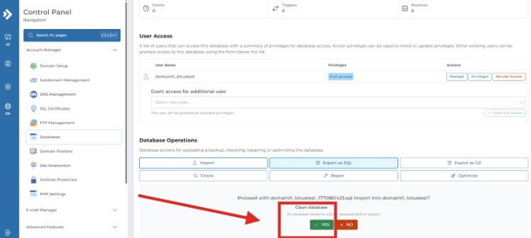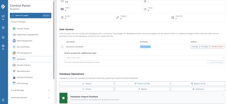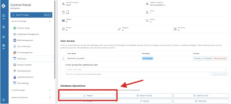2. เมื่อเข้าไปที่เมนู Database แล้วจะมีหน้าการใช้งานดังนี่ ตามรูปด้านล่างจากนั้นให้ทำการกดตรง Manage ของ Database ก้อนที่ต้องการจะ Import โดยปุ่มกดจะอยู่ด้านล่างตามรูป