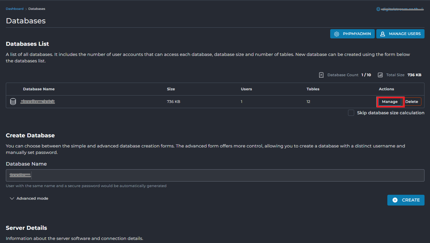 - เมื่อเข้าไปที่เมนู Database แล้วจะมีหน้าการใช้งานดังนี่ ตามรูปด้านล่างจากนั้นให้ทำการกดตรง Manage ของ Database ก้อนที่ต้องการจะ Repair โดยปุ่มกดจะอยู่ด้านล่างตามรูป
