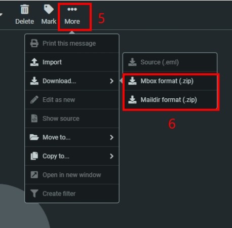 เลือกการดาวน์โหลดที่ต้องการระหว่าง Mbox format (.zip) กับ Maildir format (.zip)